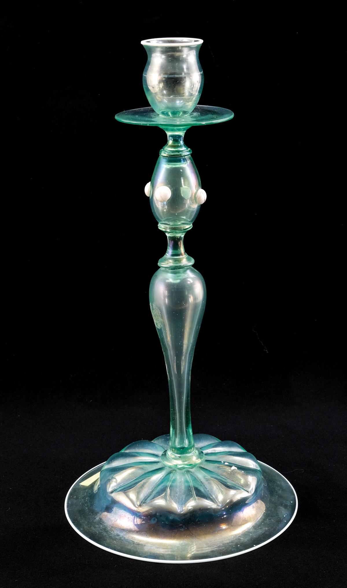 SoldAntique Venetian glass candlestickAntique Venetian glass candlestick. 17 1/2” H x 12” W x 5” D. ANY INVOICE OVER $ 2,000.00 WE WILL ACCEPT PAYMENTS ONLY THROUGH CHECK OR BANK WIRE TRANSFER, SAME FOR INTERNATIONAL BUYSee Sold Price