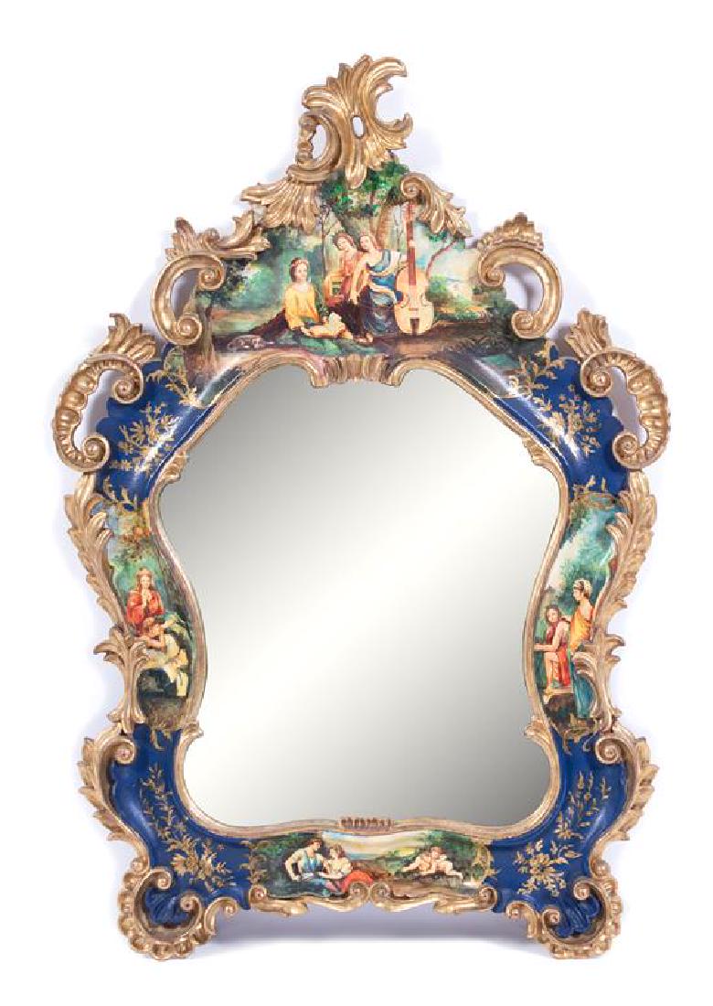 SoldVenetian Style Painted and Gilt MirrorProperty from a Private Collection, Savannah, GA Description: Venetian Style Painted and Gilt Mirror, the shaped mirrorplate surmounted by a triangular cornice painted with a courting couple, theSee Sold Price