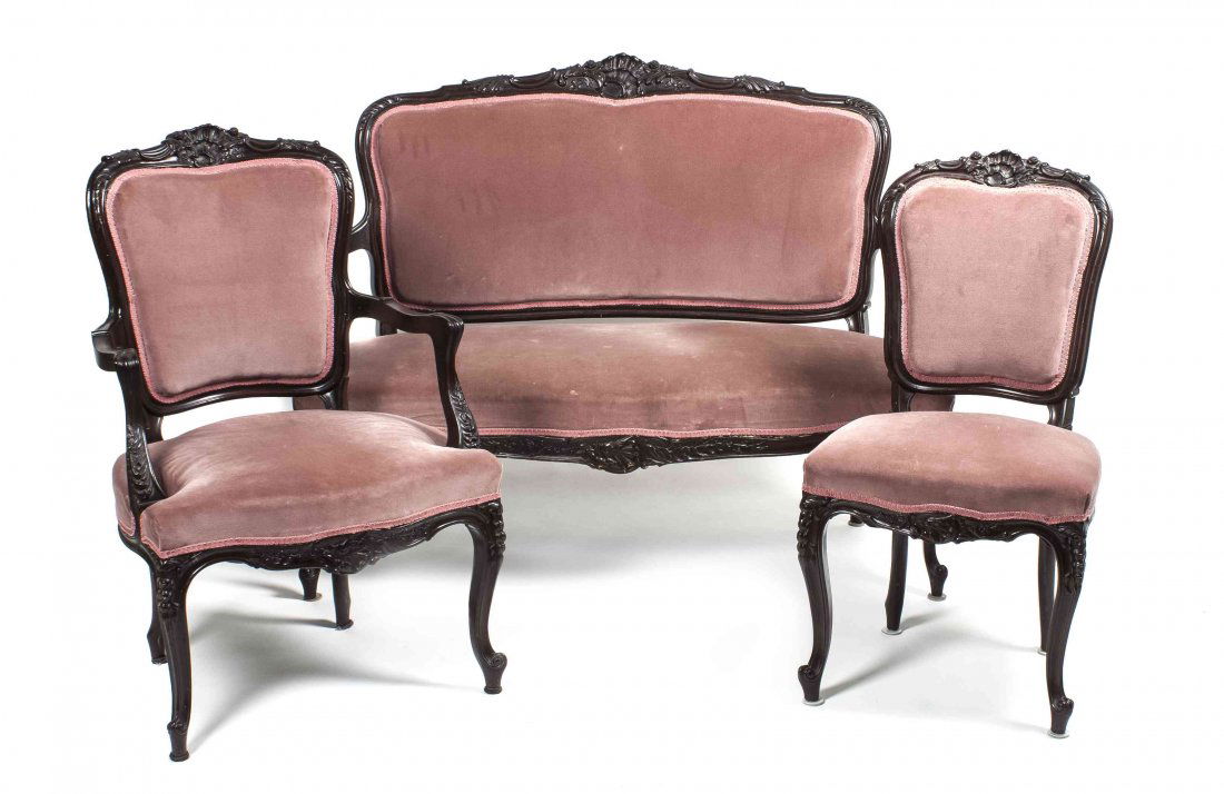 SoldA Victorian Parlor Suite in RosewoodAmerican, 19th century. A Victorian parlor suite in rosewood, including a sofa, armchair and side chair with new upholstery; ht. 40, wd. 78, dp. 30 inches. Overall good condition. ​​�See Sold Price