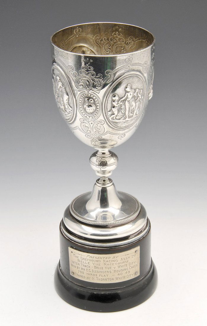 A Victorian silver Greyhound racing trophy goblet.
