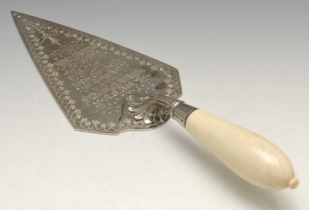 SoldVictorian Sterling Silver Presentation TrowelVictorian Sterling Silver Presentation Trowelhallmarked Sheffield, 1882-1883, by John Round & Son, the triangular blade with engraved floral scrolls and wrigglework ovolo banding, with scrolling bossSee Sold Price