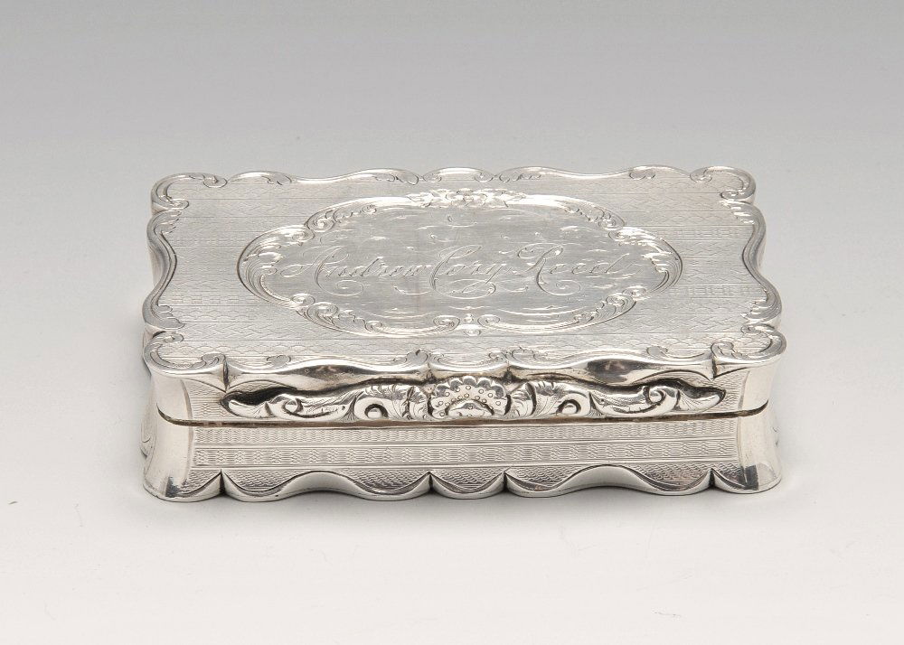A VICTORIAN SILVER SHAPED RECTANGULAR SNUFF BOXFeb 17, 2026Victorian Silver-Plated Biscuit Box5 days LeftCanton circa 1860 marked Khe Cheong A mid-19th century Chinese silver snuff boxFeb 18, 2026Antique English Sterling Silver Snuff Box3 days LeftEngland circa 1750 A George II unmarked silver table double snuff boxFeb 18, 2026EARLY RUSSIAN SILVER SNUFF BOX, 18261 day LeftAntique Sterling Silver Cigarette Box, Birmingham, Early 1900sFeb 19, 2026A FRENCH SILVER TWIN HANDLED CIRCULAR TUREEN AND COVERFeb 17, 2026George V Silver Trinket Box, Mark of George Nathan and Ridley Hayes5 days LeftA GEORGE IV SILVER SNUFF BOX AND A VICTORIAN VESTA CASEFeb 17, 2026A Vintage Silver-Tone Footed Floral Trinket BoxFeb 15, 2026Early 18th Century English Silver Tray with Rocaille and Floral Embossing, 702gFeb 15, 2026RUSSIAN IMPERIAL SILVER SNUFF BOX, 18271 day LeftA VICTORIAN SILVER SHAPED CIRCULAR SALVERFeb 17, 2026A silver seal box writing desk companion Asprey & Co Ltd, London 1920A Victorian silver inkstand Charles Stuart Harris, London 1894