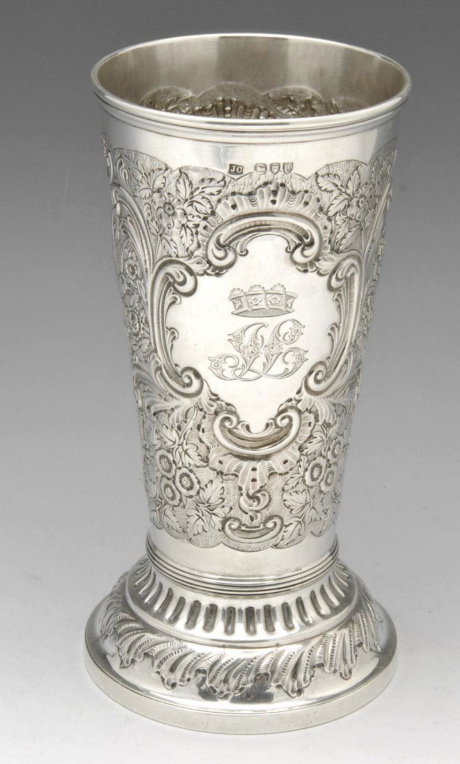 SoldAn early Victorian silver trophy vase of campana form,An early Victorian silver trophy vase of campana form, embossed with bands of trailing and fruiting vines surrounding various presentation engravings. Hallmarked London 1839 with maker's mark W.H, posSee Sold Price