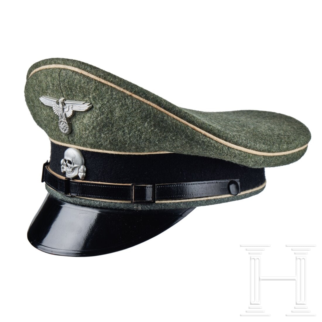 SoldA Visor Cap for Allgemeine SS OfficerA Visor Cap for Allgemeine SS OfficerCap body in black tricot wool, black velvet cap band, white piping, silver-aluminum chin cords attached by two silver finished pebbled buttons. Silver finished metSee Sold Price