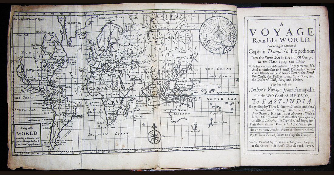 SoldVoyages.- Dampier (William) A New Voyage Round the World, first edition, for James Knapton, 1697.NO RESERVE Voyages.- Dampier (William) A New Voyage Round the World, first edition, 5 engraved maps (4 folding), folding frontispiece wormed at lower margin, some marginal foxing or light soiling, inkSee Sold Price