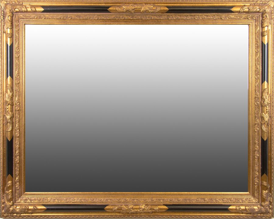 A WALL MIRROR WITH BLACK AND GOLD FRAME