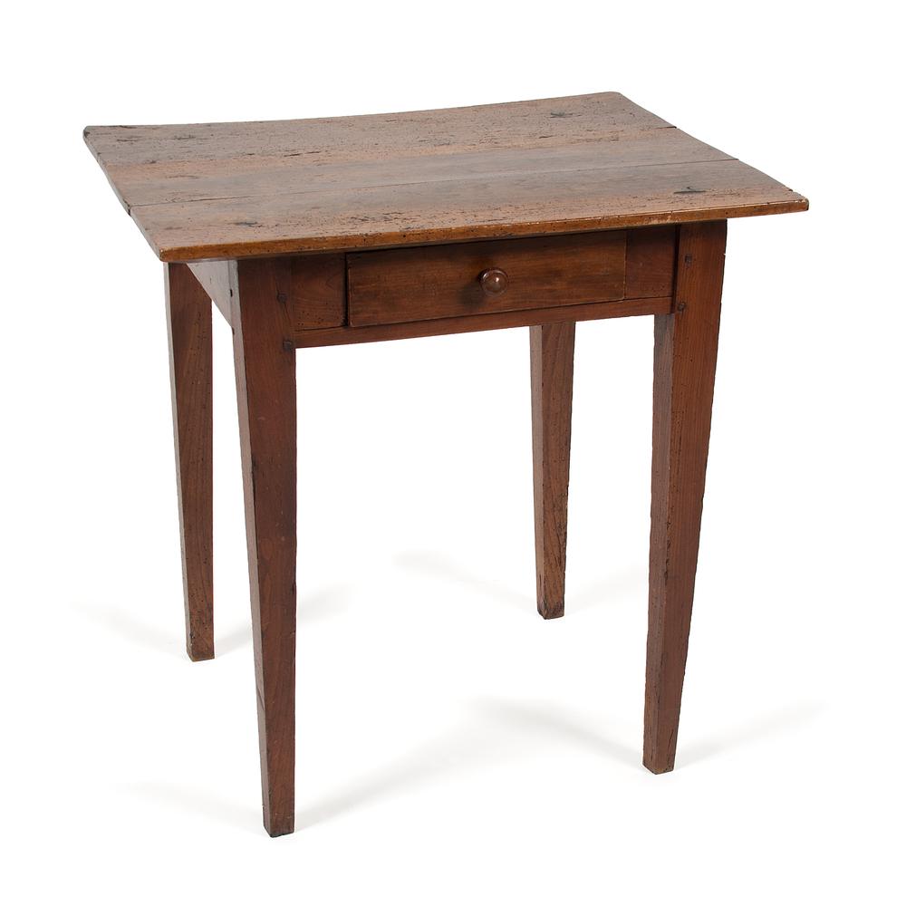 SoldLouis XIII walnut side tableLouis XIII walnut side table, c. 1640s, France, the two-board top with molded border, above a frieze drawer, raised on turned legs joined by box stretcher, wood pin construction, remnant paper label tSee Sold Price