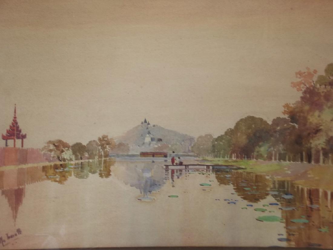 A watercolour, Oriental temples by a lake, signed