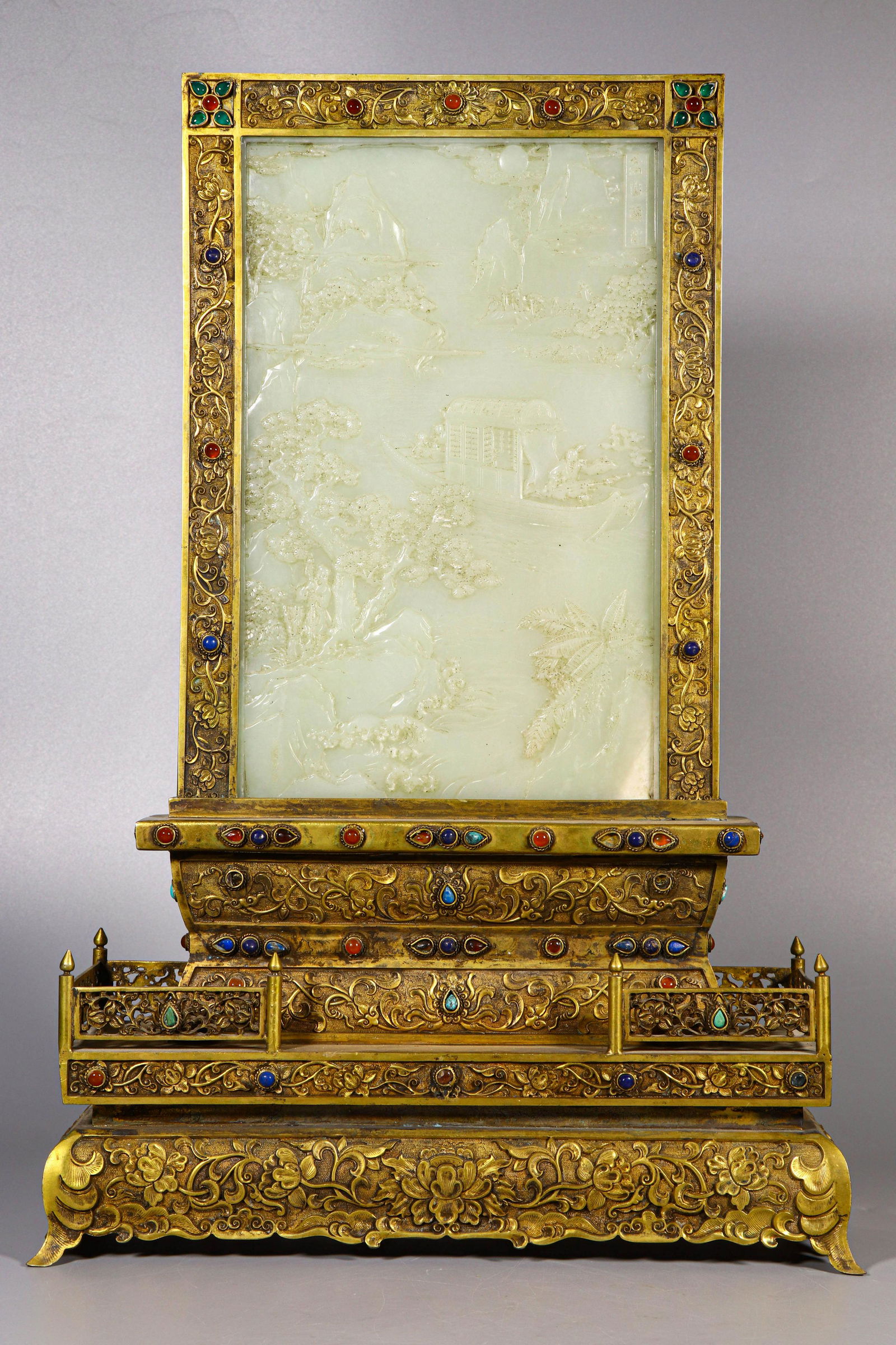 A WHITE JADE AND GILDED BRONZE TABLE SCREEN