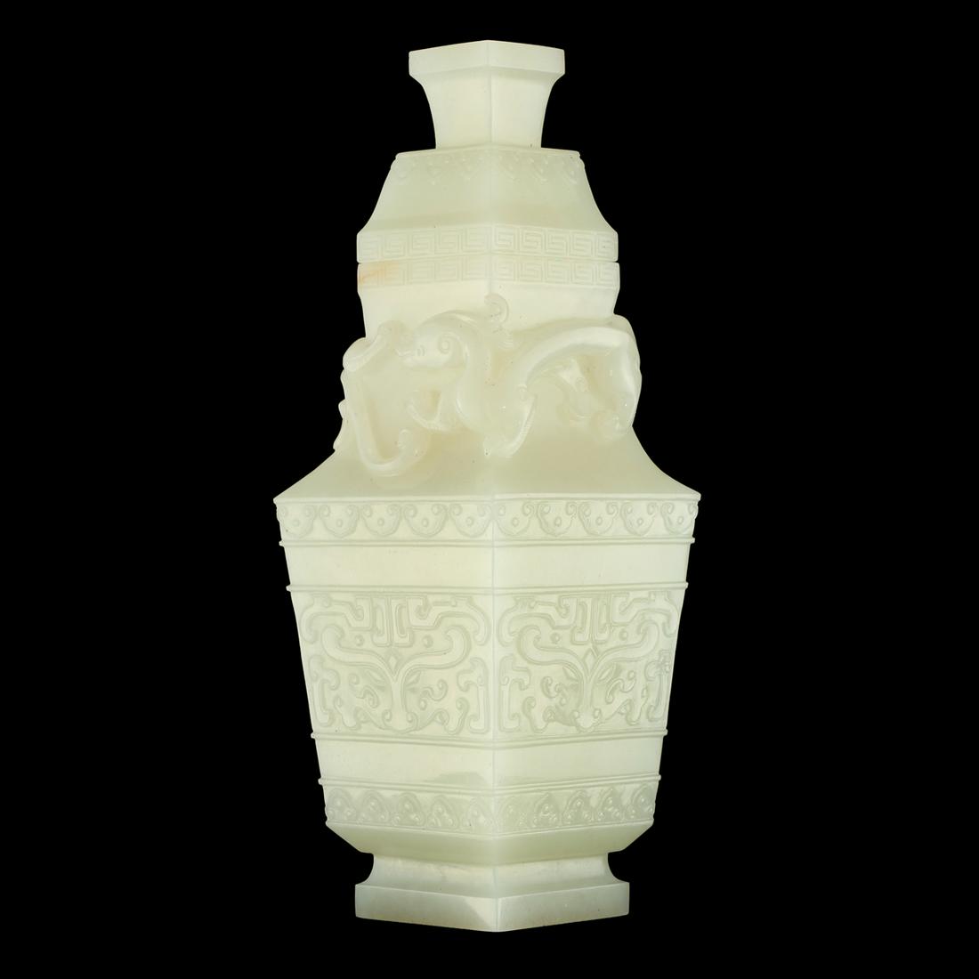 A WHITE JADE 'BEASTS' SQUARED VASE