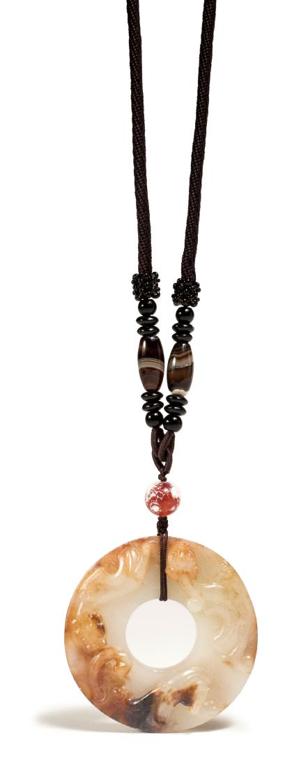 SoldA Chinese pale celadon or white jade disc, BiA Chinese pale celadon or white jade disc, Bi , carved in high relief with a coiled chilong holding a spray of lingzhi fungus in its mouth, the reverse is carved with a pattern of raised nodes, the stSee Sold Price