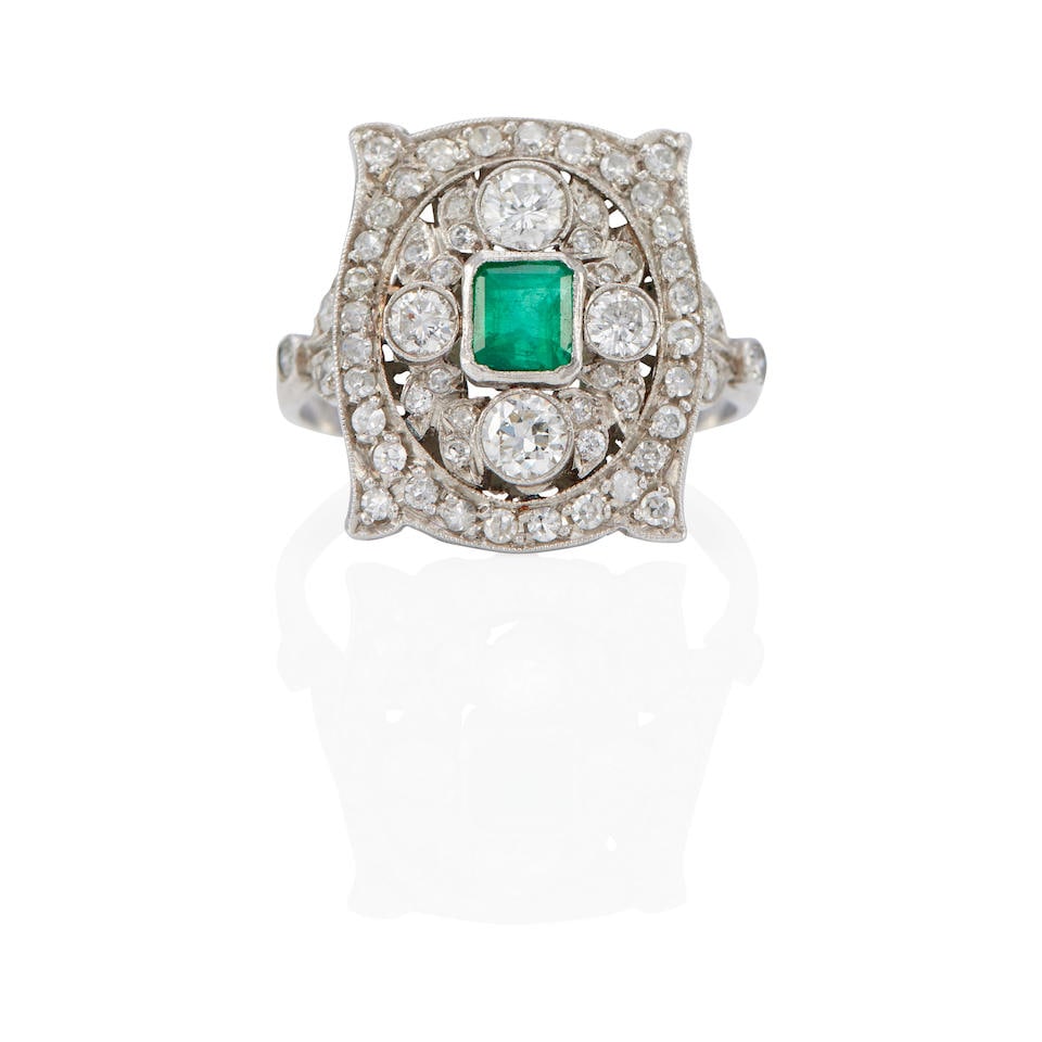 A WHITE METAL, EMERALD AND DIAMOND RING