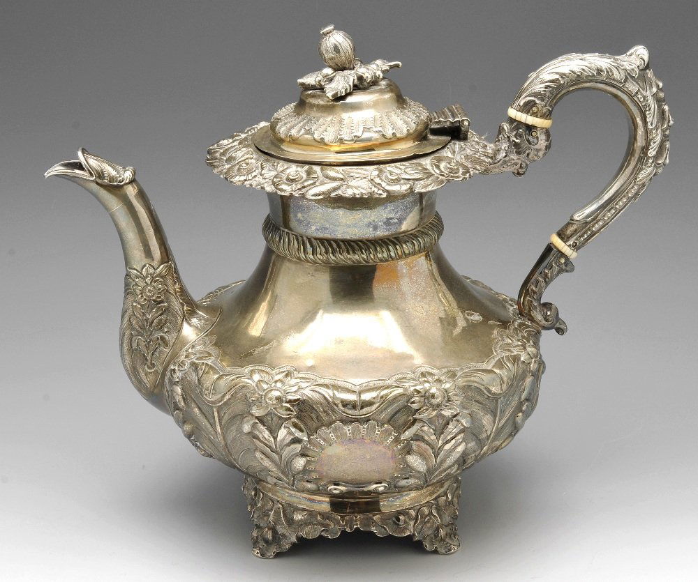 Silver coffee pot with a pear-shaped, twisted body, resting on three graceful feet. It features aFeb 15, 2026Y A WILLIAM IV SILVER LOBED BALUSTER COFFEE POTFeb 17, 2026Silver coffee pot with a turned body, chiseled with rocaille and floral ornamentation, France ca.Feb 15, 2026Elegant silver coffee pot or 'marabou can', possibly by Maison Van Dievoet (Brussels), with aFeb 15, 2026Silver coffee pot with a pear-shaped, twisted body, resting on three graceful feet. It features aFeb 15, 2026Richly decorated silver teapot, Louis WOLFERS, with pear-shaped, fluted body and applied floralFeb 15, 2026Antique Georgian English embossed sterling silver repousse floral coffee / tea pot, London, 1753,Feb 21, 2026Elegant silver jug, Maison Touron, made in Minerve 1st grade, with a richly modelled, pear-shapedFeb 15, 2026Vintage Reed & Barton Regent 5600 Silverplate Coffee Pot Tea PotFeb 25, 2026London 1805 by Peter and William Bateman A George III sterling silver teapotFeb 18, 2026Loring Andrews Sterling Silver "Castle" Pattern Tea Pot, #20715 hrs LeftA GEORGE IV SILVER TEAPOTFeb 17, 2026Silver coffee pot with hammered spout in the shape of a swan's neck and twisted and hammered handle,Feb 15, 2026A GEORGE III SILVER KETTLE ON STANDFeb 17, 2026A George III Sterling Silver Teapot, Robert Jones II, London, 1796Feb 15, 2026Gorham Sterling Repousse Hot Water Kettle on StandFeb 26, 2026