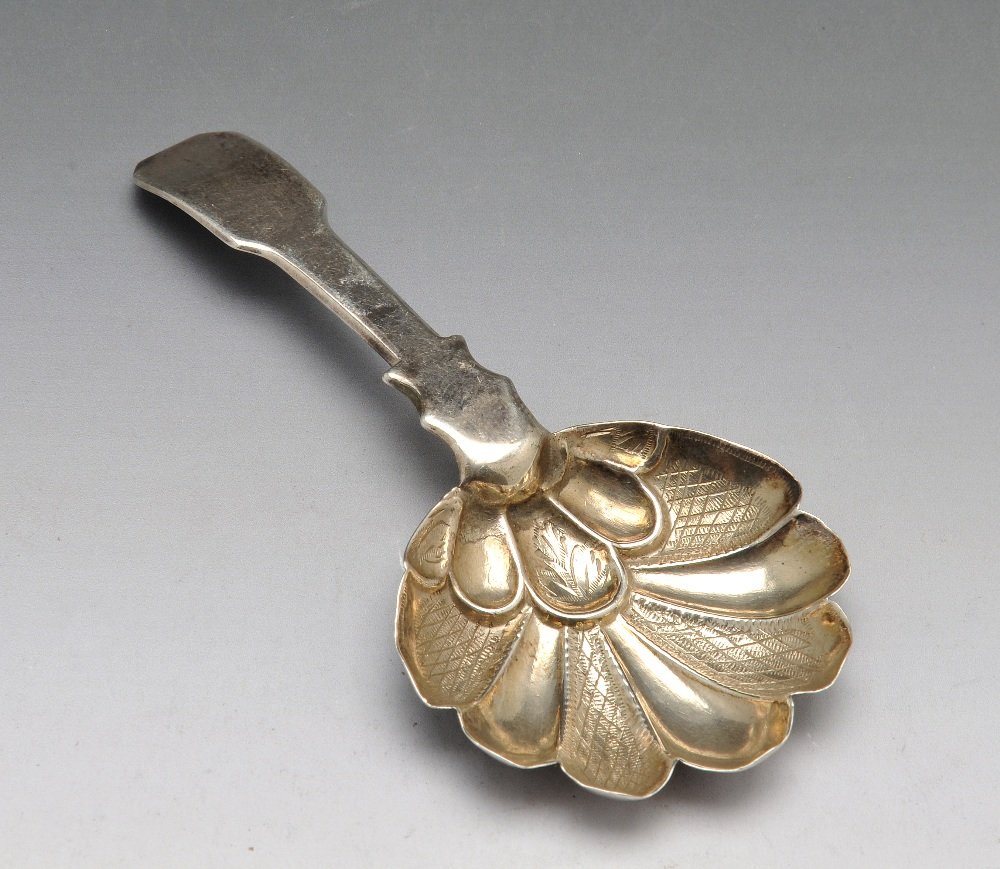 SoldThree Georgian Sterling Silver Caddy Spoons,one of shell form, one in fiddle pattern and one with feathered edge, (3)See Sold Price