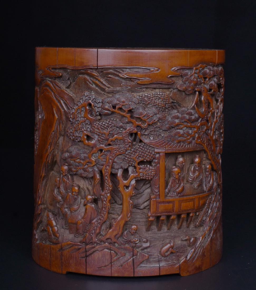 A WOOD CARVED BRUSH POT