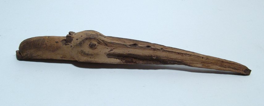 A wooden ibis head from a mummy bundle