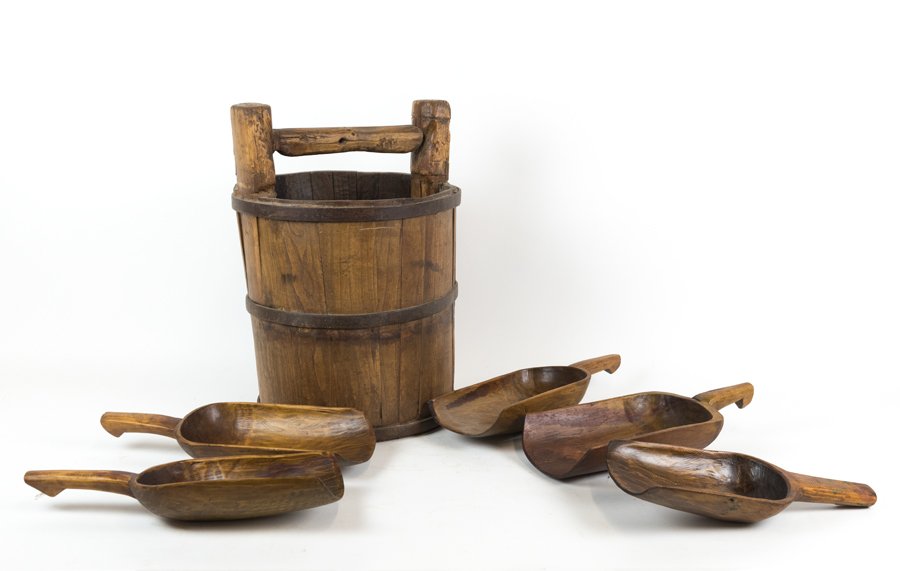 A WOODEN PEAT BUCKET WITH FIVE SCOOPS