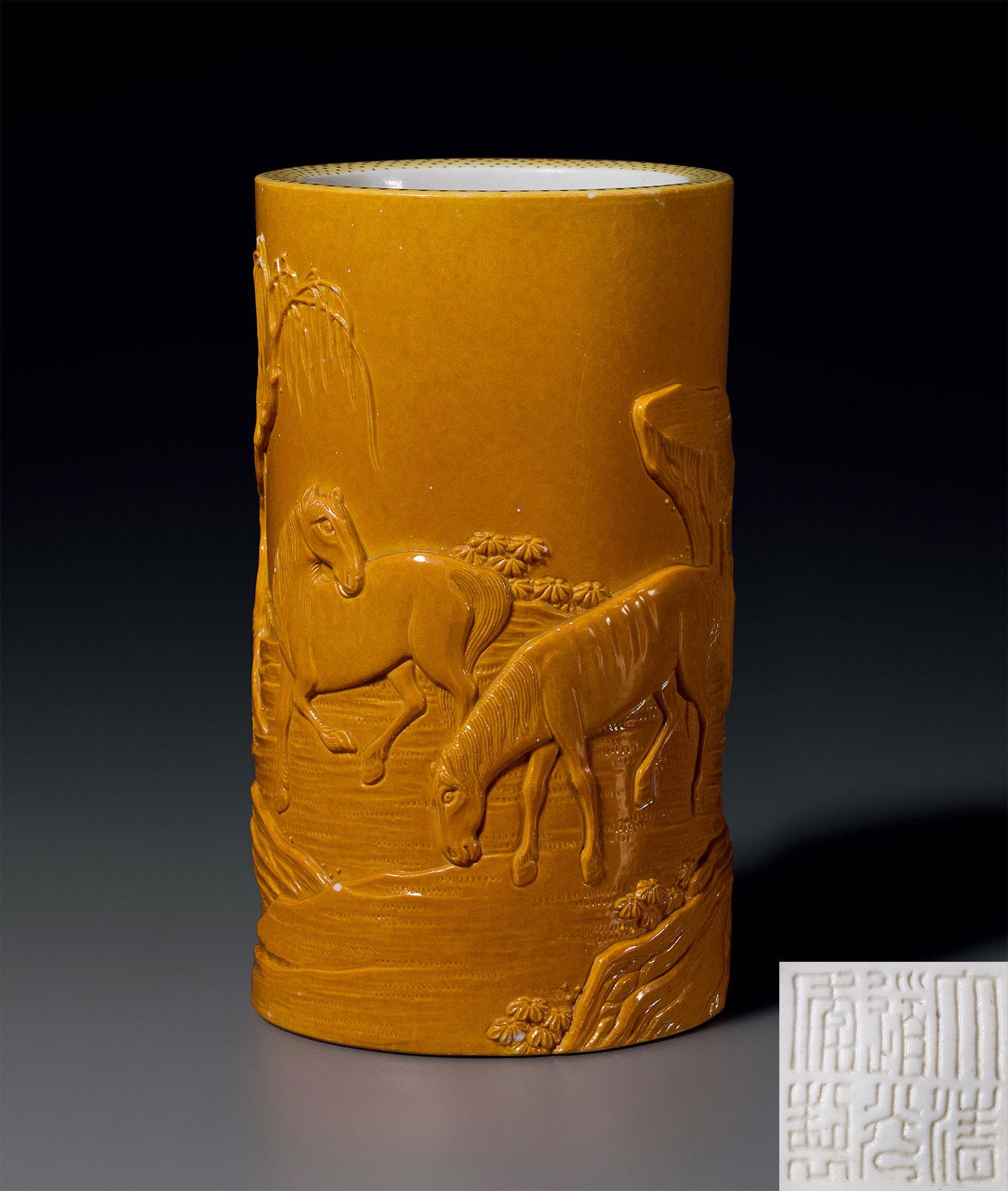 A YELLOW-GLAZED 'HORSE' BRUSHPOT