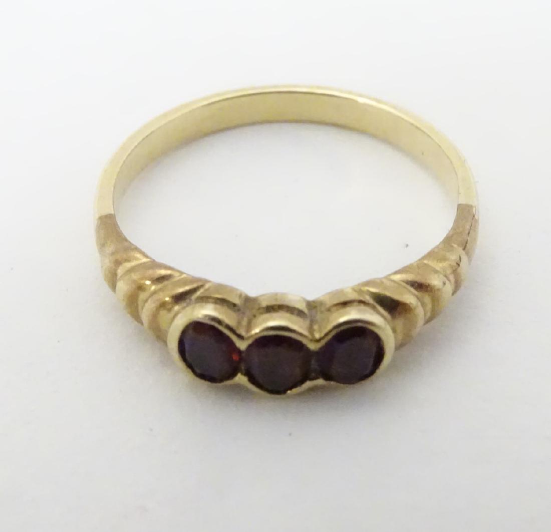 A yellow metal ring set with three garnets