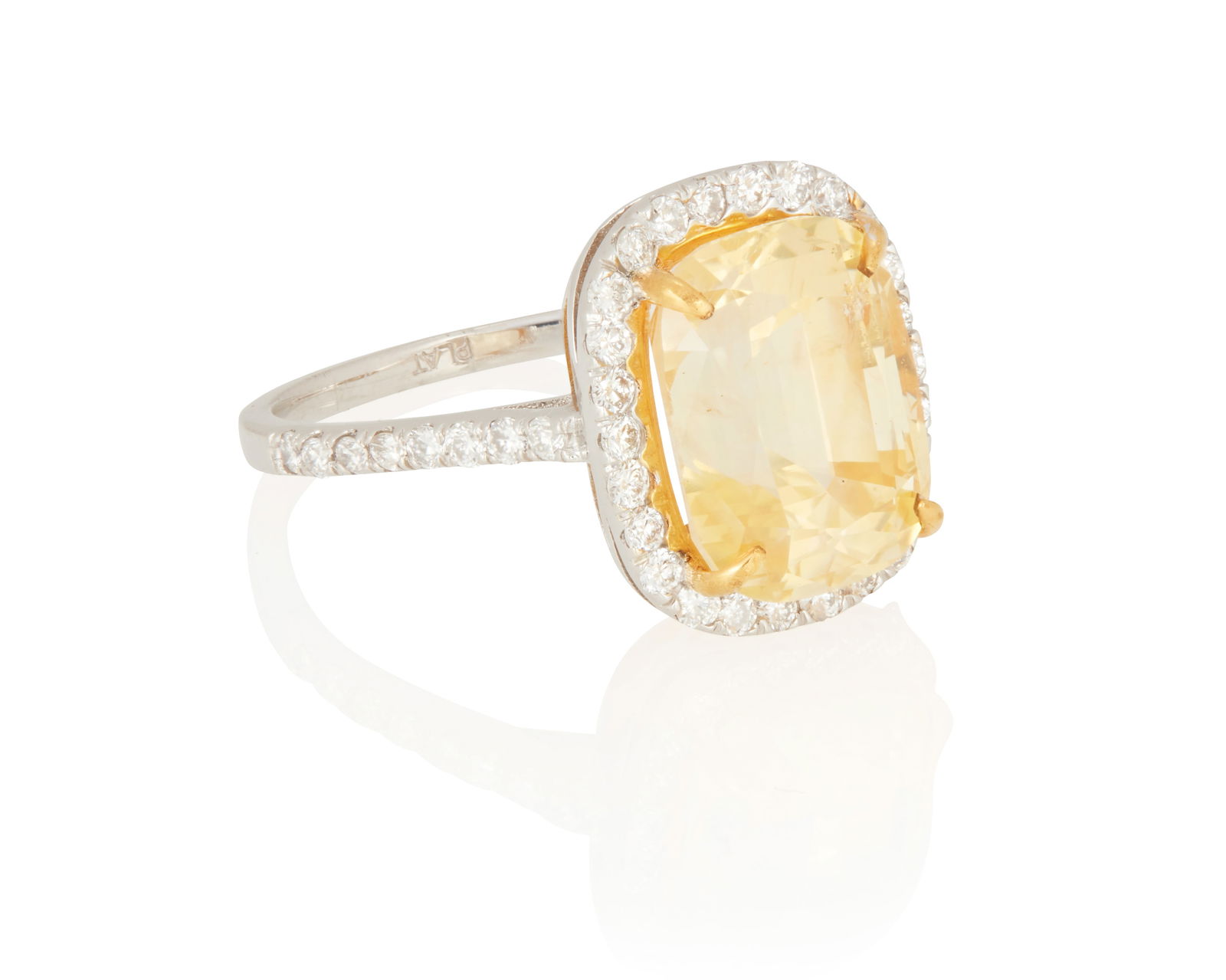 SoldAN UNHEATED YELLOW SAPPHIRE AND DIAMOND RING in platinum, set with a cushion cut yellow sapphire ofAN UNHEATED YELLOW SAPPHIRE AND DIAMOND RING in platinum, set with a cushion cut yellow sapphire of 9.43 carats accented by old cut diamonds, stamped PLAT, size O / 7, 5.9g. Accompanied by a gemmologiSee Sold Price