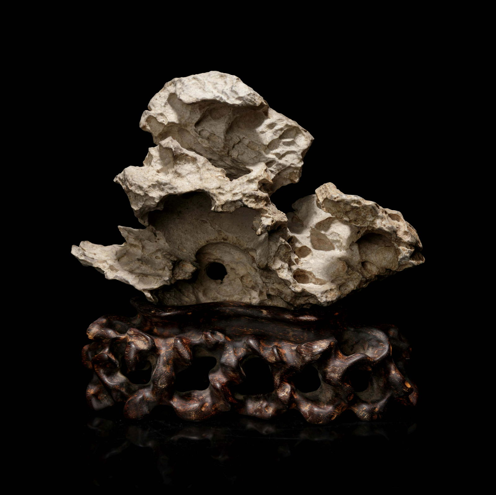 SoldChinese Ying limestone scholar's rockChinese Yingde limestone scholar's rock, of homogeneous grey color and having a craterous surface, displaying white striation, Jiangnan style wood stand, overall height 15.75".See Sold Price