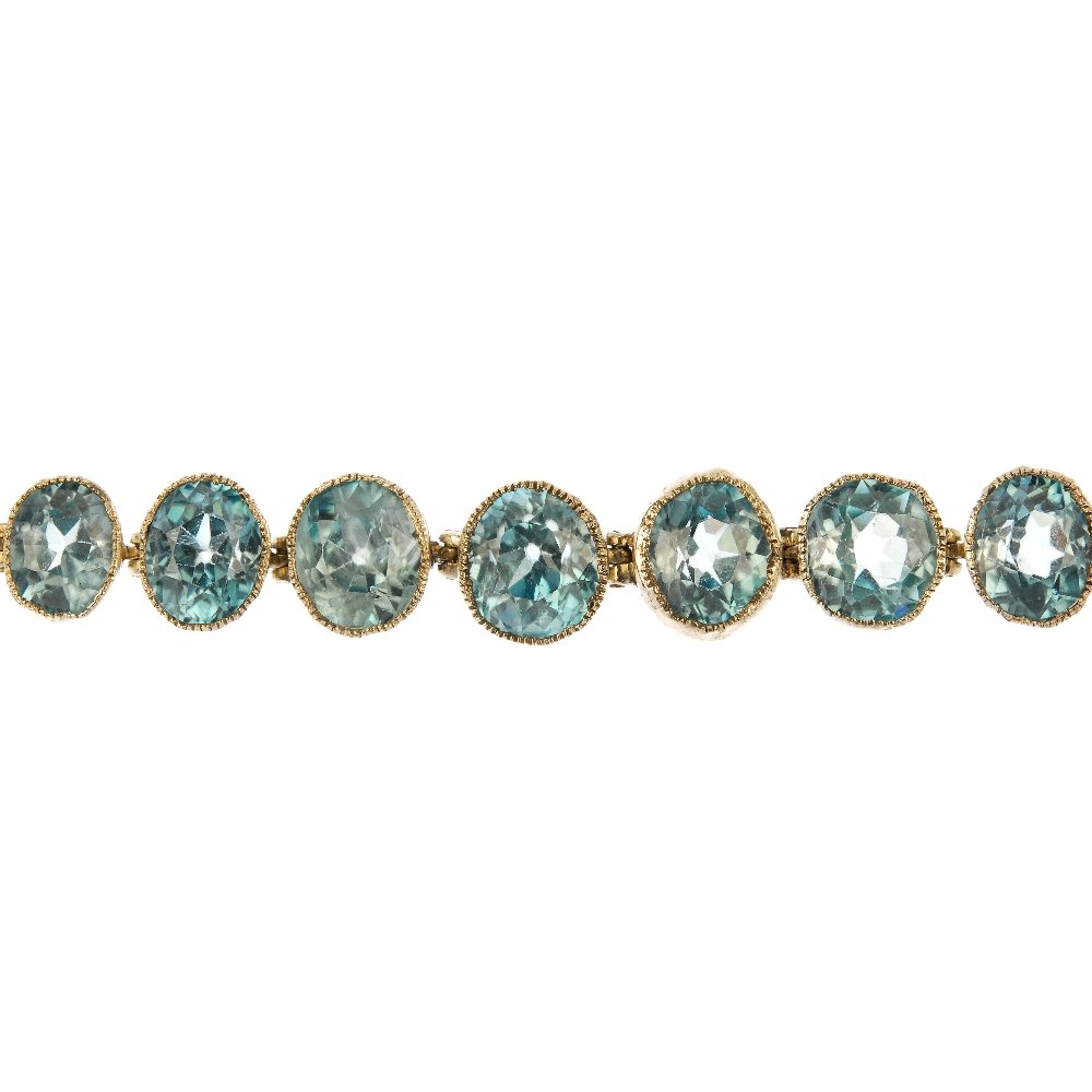 SoldA blue zircon bracelet,A blue zircon bracelet, with a central row of nine round mixed cut blue zircons all in a claw setting, to plain links, to a barrel snap clasp, tested as approximately 14ct gold, 140mm long, 11.67g ConSee Sold Price