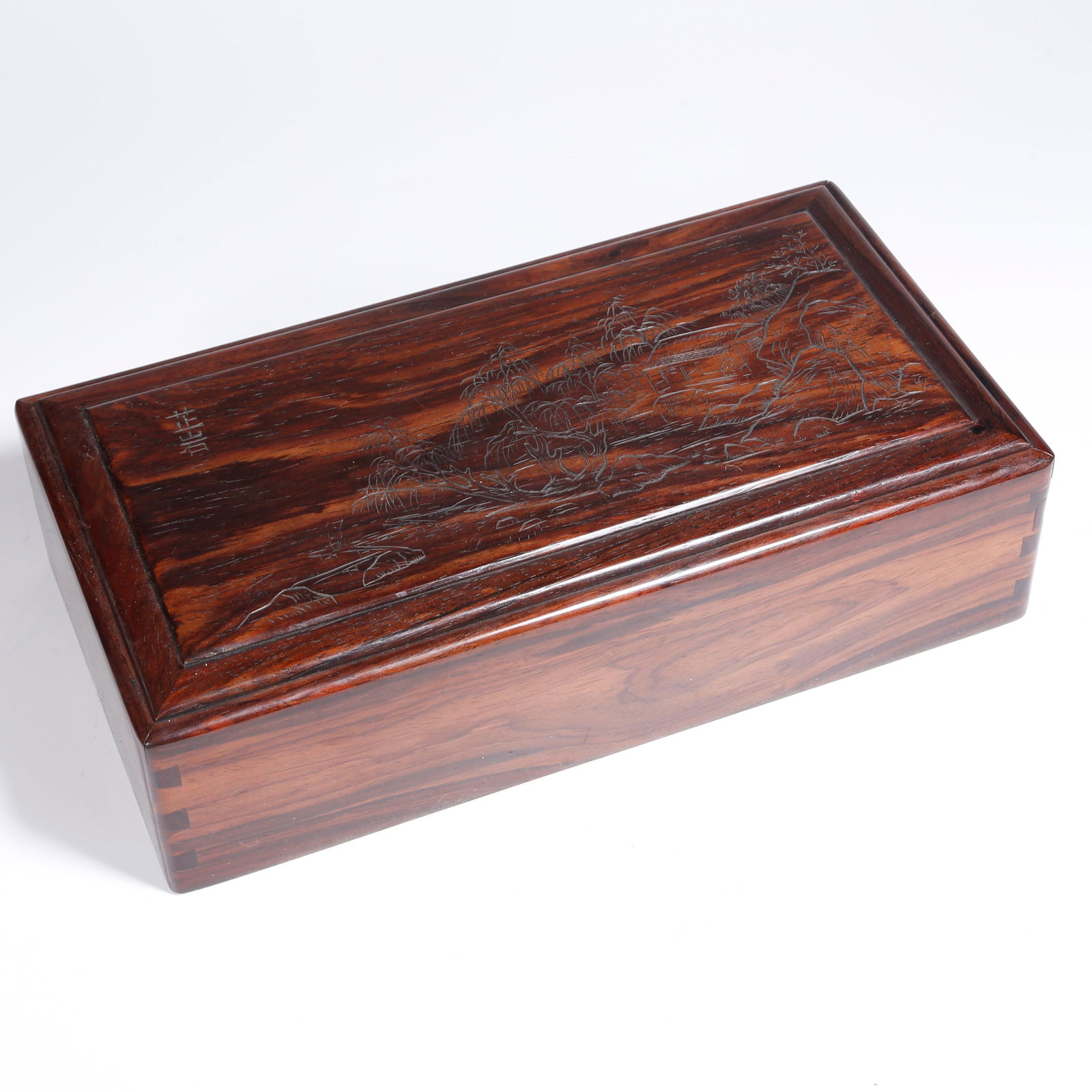 A ZITAN WOOD LANDSCAPE PATTERN LIDDED BOX