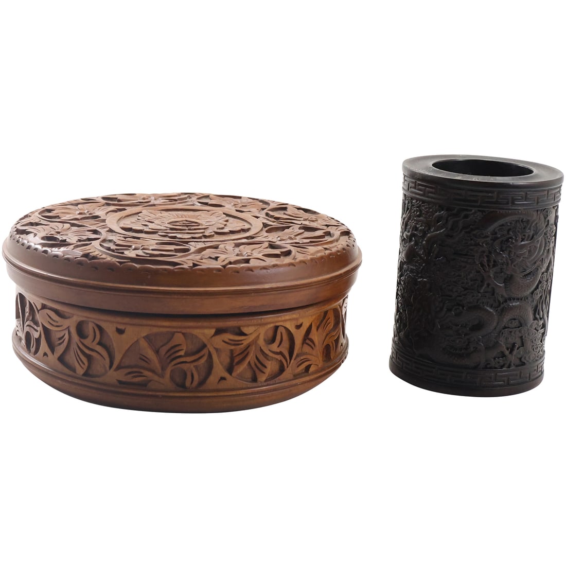 [2] Antique Chinese Carved Covered Round Box and Carved Cylindrical Jar