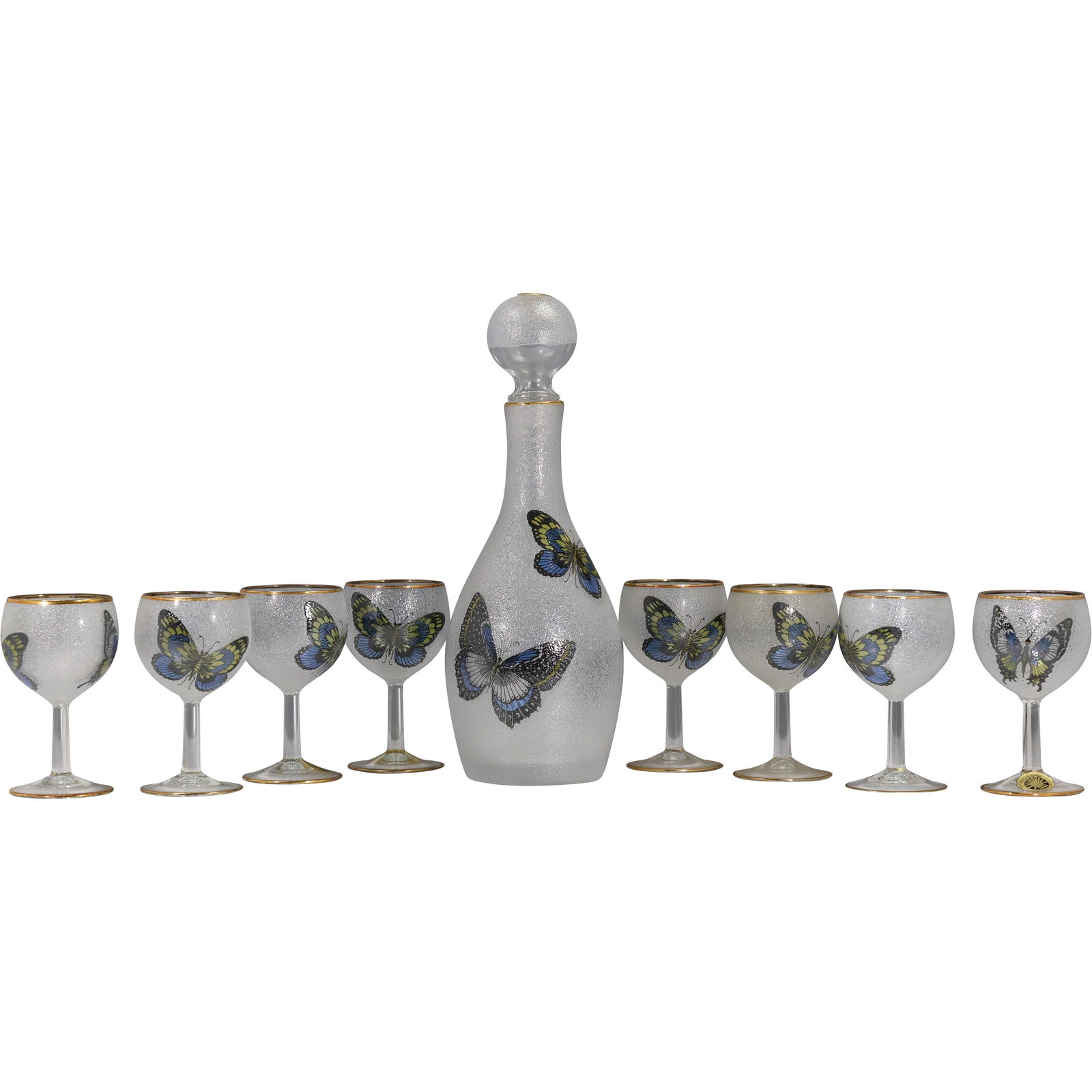 Frosted Glass "Butterflies" Decanter with 8 Matching Stemmed Goblets