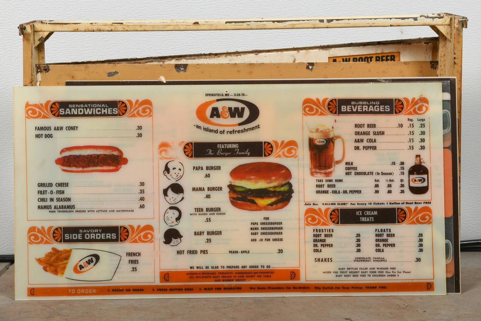 Misc. lot of advertising signsMar 20, 2026(2) 7-Up Sold Here Glass Menu Boards LotMar 14, 2026Mason's Root Beer neon signMar 28, 2026A and W Root Beer Plastic Drive Thru Sign SkinMar 20, 2026Hires Root Beer signMar 28, 2026Triple AAA Root Beer signMar 27, 2026Triple AAA Root Beer signMar 27, 2026Manson Root Beer Glass Menu BoardMar 14, 2026Hires Root Beer signMar 28, 202611 vintage metal restaurant signs in various sizesMar 08, 2026Pepsi Embossed Tin Menu BoardMar 20, 2026A&W Root Beer Single-Sided Porcelain Advertising SignMar 14, 2026Burger Beer Double Sided Plastic SignMar 20, 2026Antique Diner Pepsi Advertising Menu SignMar 01, 2026Brownie Root Beer signMar 28, 2026