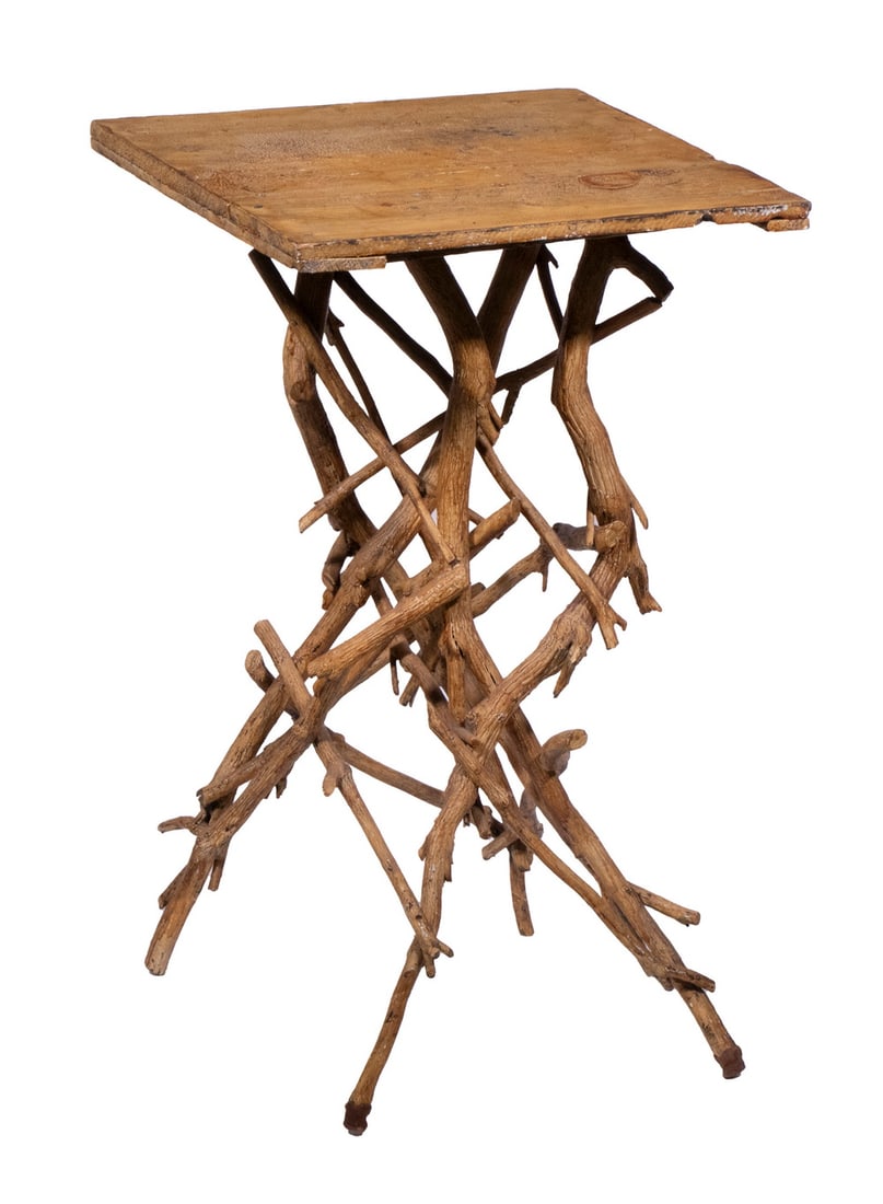 SoldAdirondack Mosaic Twig StandTitle: Adirondack Mosaic Twig Stand Date: circa 1890 Origin: American Materials: Wood Dimensions: 19" square top, 28.75" high Provenance/Additional Information: This stand's tripod base is made from sSee Sold Price