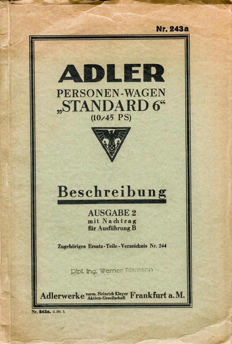 Adler Operating Instructions 'Standard 6' from 1929