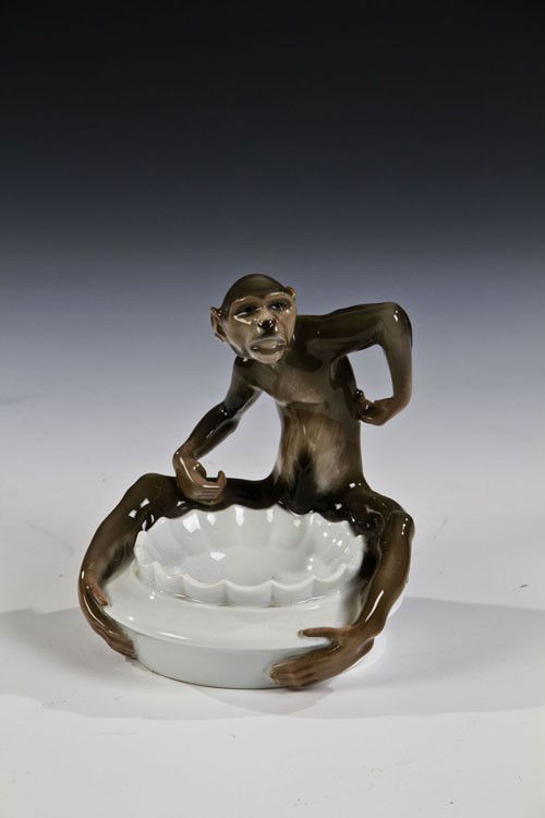 SoldAffenschaleAffenschale Gustav Oppel/Ferdinand Liebermann (Entwurf) 1910, Rosenthal (Ausführung), 1930 Runde Schale mit am Rand sitzendem Affen. Staffiert in Unterglasurbeige-, braun- und schwarztönen. UnterglaSee Sold Price