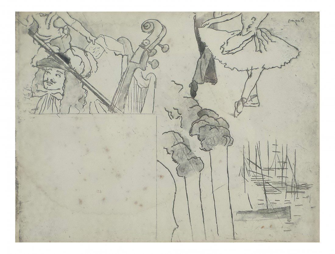 SoldAfter Degas, Canceled EtchingAfter Edgar Degas. Canceled etching, likely for a theatre program or menu. Signed upper right in the plate, in reverse. [Sight: 9 1/2" x 12 1/4"; Frame: 16 3/4" x 20"]. Water stains, foxing, light tonSee Sold Price