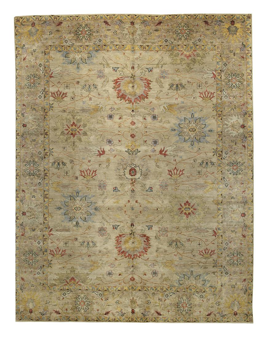 SoldSultanabad CarpetSultanabad Carpet finely hand woven Persian Sultanabad carpet, late 19th century, featuring an ivory ground with an allover pattern of stylized palmettes, rosettes, and serrated leaves in shades of brSee Sold Price