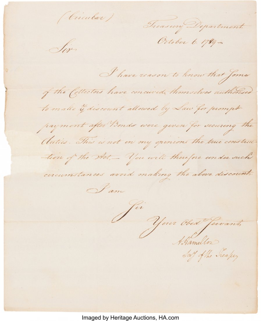 Alexander Hamilton Treasury Circular Signed with