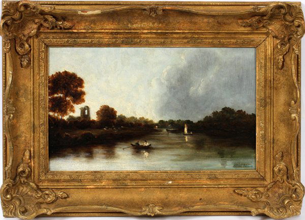 ALFRED VICKERS OIL ON PANEL RIVER SETTING, BOAT
