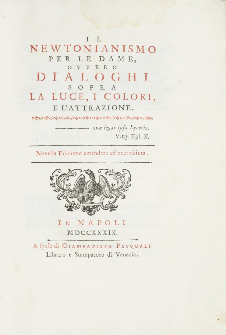 SoldALGAROTTI, Francesco. Dialoghi sopra la LuceALGAROTTI, Francesco. Dialoghi sopra la Luce, i Colori, e l’Attrazione. Napoli, Giambattista Pasquali, 1752 8vo picc., mm. 180x130; Leg. coeva in cart. alla rustica; pp. XII, 208, [4 b.]. Fresco eseSee Sold Price