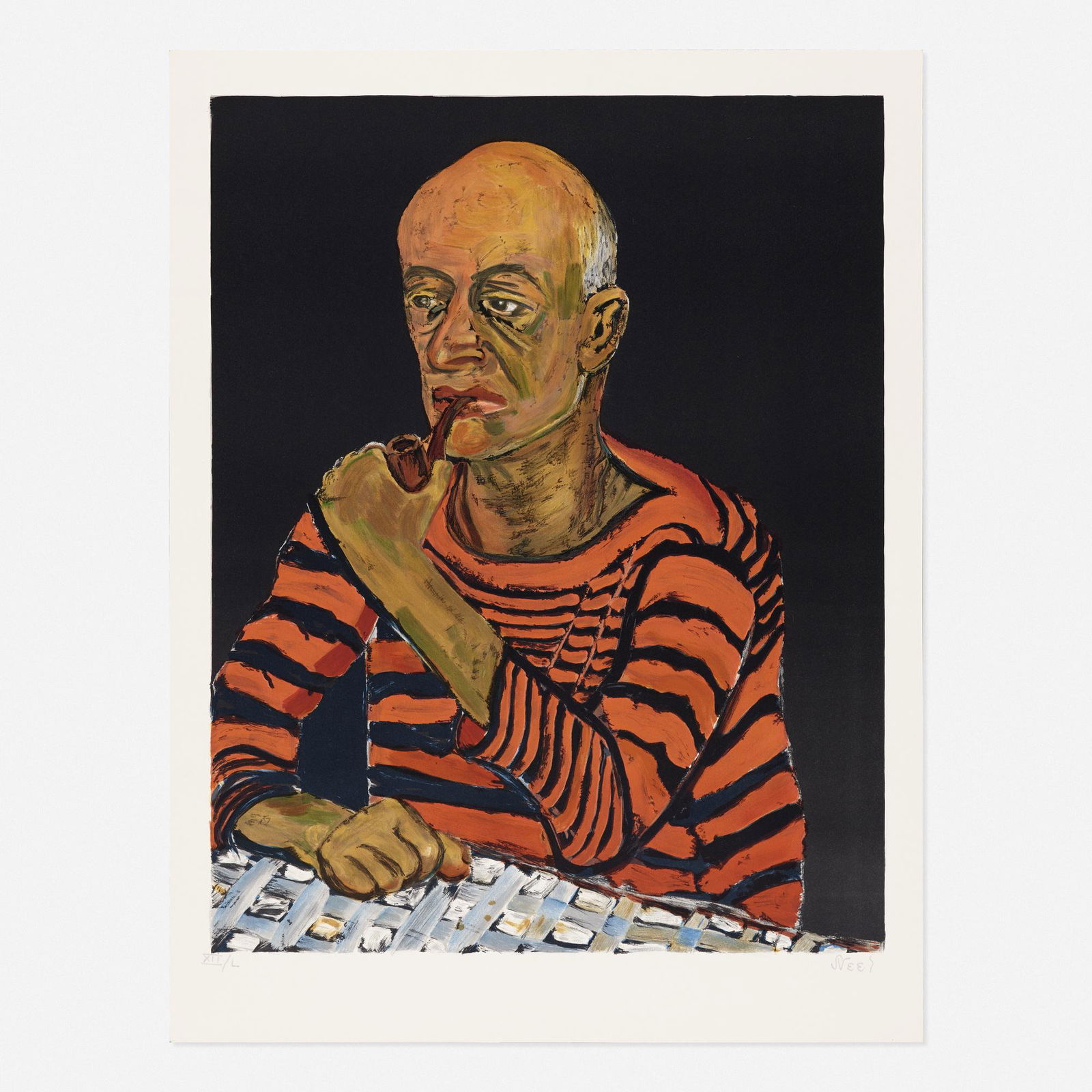 SoldAlice Neel, John (Man with Pipe)Alice Neel John (Man with Pipe) (from the American Portfolio) 1980lithograph in colors sheet: 27.625 h × 21.25 w in (70 × 54 cm) image: 23.875 h × 19.125 w in (61 × 49 cm)<See Sold Price