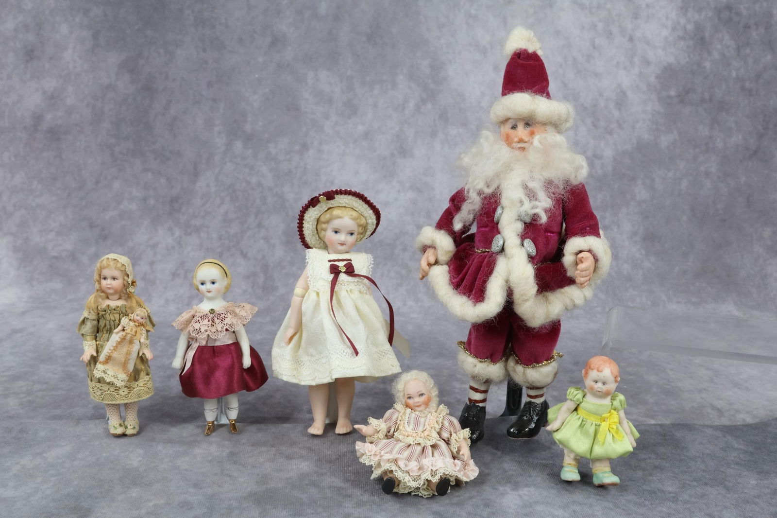Sold302. FIVE SMALL BISQUE DOLLS & BISQUE ARTIST’S DOLL302. FIVE SMALL BISQUE DOLLS & BISQUE ARTIST’S DOLL "LORI". Two bisque dolls with molded bonnets, original cloth bodies; three small all-bisque dolls, 3 ¾" to 5". 15" bisque socket head doll "Lori"See Sold Price