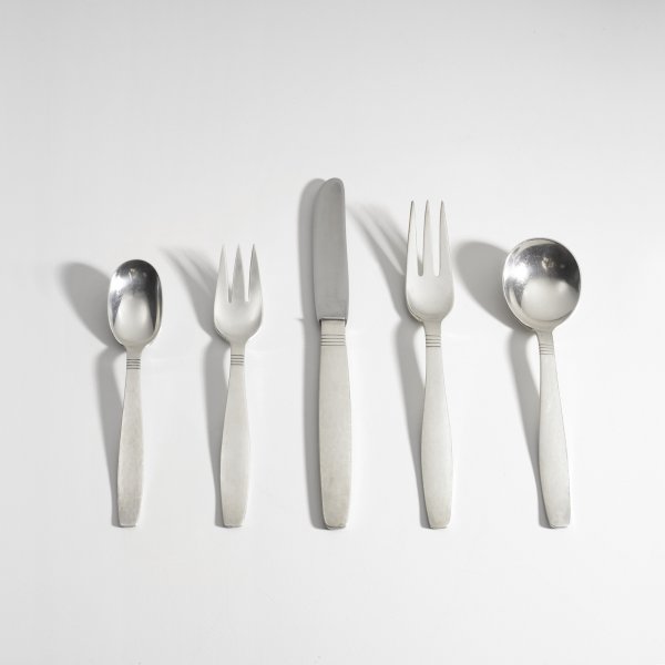 SoldFolke Arstrom for Gense Stainless Steel Flatware Service for 8 With ExtrasSwedish Modern stainless steel flatware service, "Focus" by Gense, including 7.75" dinner forks, 7.75" knives, salad forks, soup spoons, teaspoons, iced teaspoons, a butter spreader, and a sugar spoonSee Sold Price