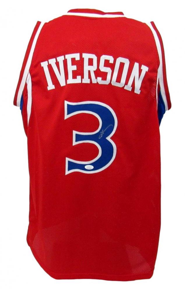 SoldAllen Iverson Signed Jersey (JSA COA)Custom on-court style jersey. Everything sewn on, size XL. Hand-signed by Allen Iverson (HOF). The lot / autograph(s) includes an official James Spence Authentication (JSA) hologram and matching COA fSee Sold Price
