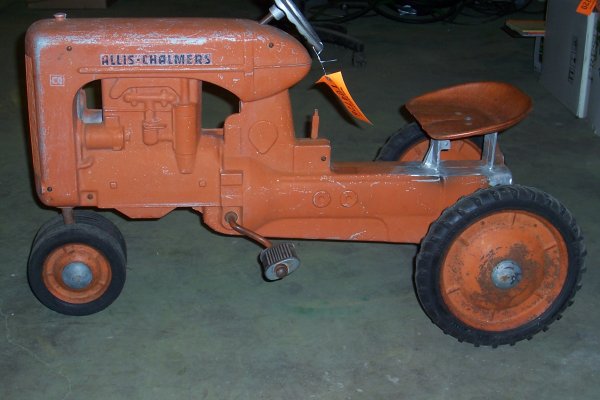 SoldAllis Chalmers Pedal Tractor WD-4518" x 39" Metal pedal tractor with exhaust pipes in excellent condition with minor paint flakes. PLEASE READ & UNDERSTAND THE PAYMENT & SHIPPING TERMS FOR THIS AUCTION PRIOR TO PLACING BIDS. ALL BIDDESee Sold Price