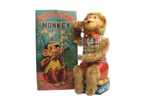 Sold3- JAPAN BATTERY OP TOYS w/ BOXESincludes Rock N Roll Monkey, Crap Shooting Monkey, and Bubble Blowing Monkey. All in nice original condition. Boxed. largest 12" AS-ISSee Sold Price