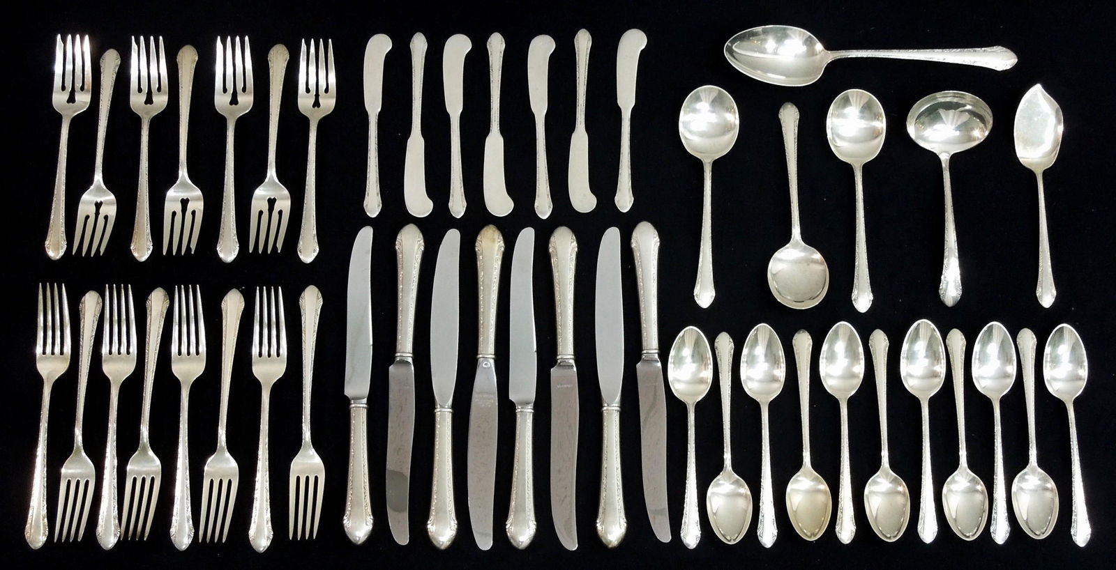 Lot of Sterling Silver Flatware Pieces, 54.07 Troy OuncesMar 14, 2026INTERNATIONAL SILVER CO. AND OTHER STERLING AND 0.950 SILVER FLATWARE AND SERVING UTENSILS, LOT OFMar 04, 2026Large lot of sterling silver and silver handled utensils. To include: Durgin serving fork and spoonMar 01, 2026Collection Handsome Sterling Silver Flatware SetsFeb 28, 2026(109) AMERICAN WALLACE 'ANTIQUE' STERLING SILVER FLATWARE SERVICE1 day Left(103) AMERICAN LUNT 'MARY II' STERLING SILVER FLATWARE SERVICE1 day Left(46) SWEDISH KAB .830 SILVER SCALLOPED FLATWARE SERVICE1 day LeftLarge Collection of Antique & Vintage Silver Plate Flatware CutleryArt Deco Sterling Silver Flatware Partial Service, Chased Romantique By AlvinFeb 28, 202671-Piece Sterling Silver .925 Flatware SetAlvin Chateau Rose Sterling Silver Flatware Set for 12 104 Pieces5 days LeftWestmoreland Milbourn Rose pattern sterling silver partial flatware service, 26pc., 21.222ozt.6 hrs LeftCollection of Sterling Flatware5 days Left"Melrose" by Gorham Sterling Silver Flatware (34) 764 GramsMar 28, 2026Tiffany & Co. "Wave Edge" sterling flatware set.3 days Left101 Pieces Mixed Sterling Silver Flatware.Feb 28, 2026