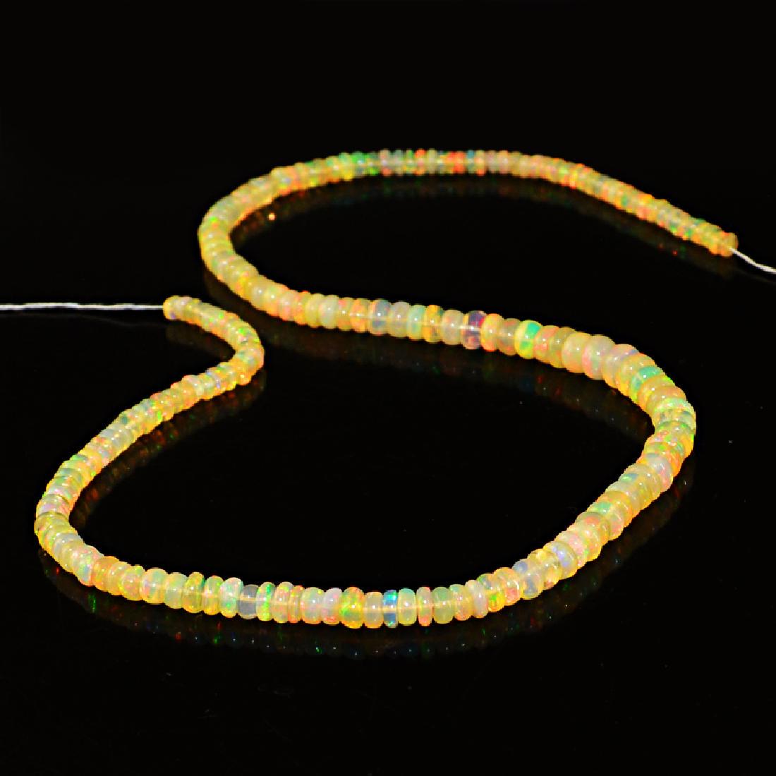 SoldFire Play Ethiopian Opal Beads StrandPieces : Ethiopian Opal Strand Color : Fire Play Gemstone : Ethiopian Opal Total Weight : 6.42 gms Weight : 32.10 cts Length : 17 Inches Bead Size : 02 x 03 mm Please note that this lot haSee Sold Price