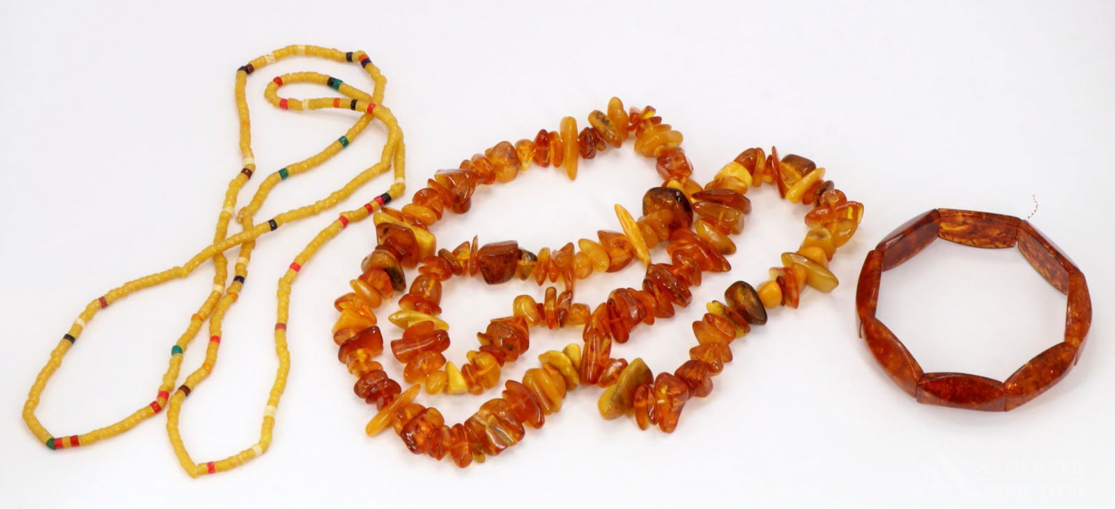 SoldTwo amber necklaces and braceletEach necklace approx. 16 inches, with faceted and flat beads.See Sold Price