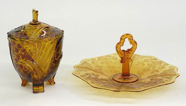 Sold[3] Carnival Glass Bowl and Decanter , Amber Glass Covered Bowl[3] Carnival Glass Bowl and Decanter , Amber Glass Covered Bowl. size: tray 3.5h 8.5w jar 5.5h 4.25w bottle 10.5h 5wSee Sold Price
