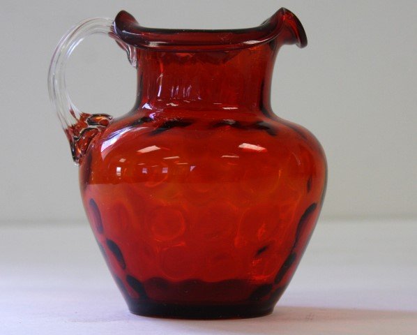 Sold3 Pcs. Blenko Art GlassBlenko Glass Co.: 1. Amberina optic dot pitcher with applied ribbed handle, unmarked; 10"H---2. Amberina optic dot vase with flared rim, unmarked; 10 1/2"H--3. Amberina crackle pitcher with applied haSee Sold Price