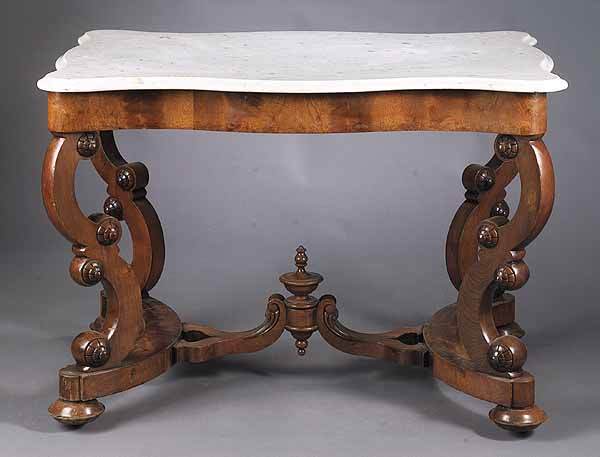 Walnut American Turtle Top Shape Center Table, Carved Rosettes & Fruit, X Stretcher Base on Castors,Walnut American Turtle Top Shape Center Table, Carved Rosettes & Fruit, X Stretcher Base on Castors, 30"h x 41"w x 36"d ***If this item is not picked up by the Friday following the auction, it will be